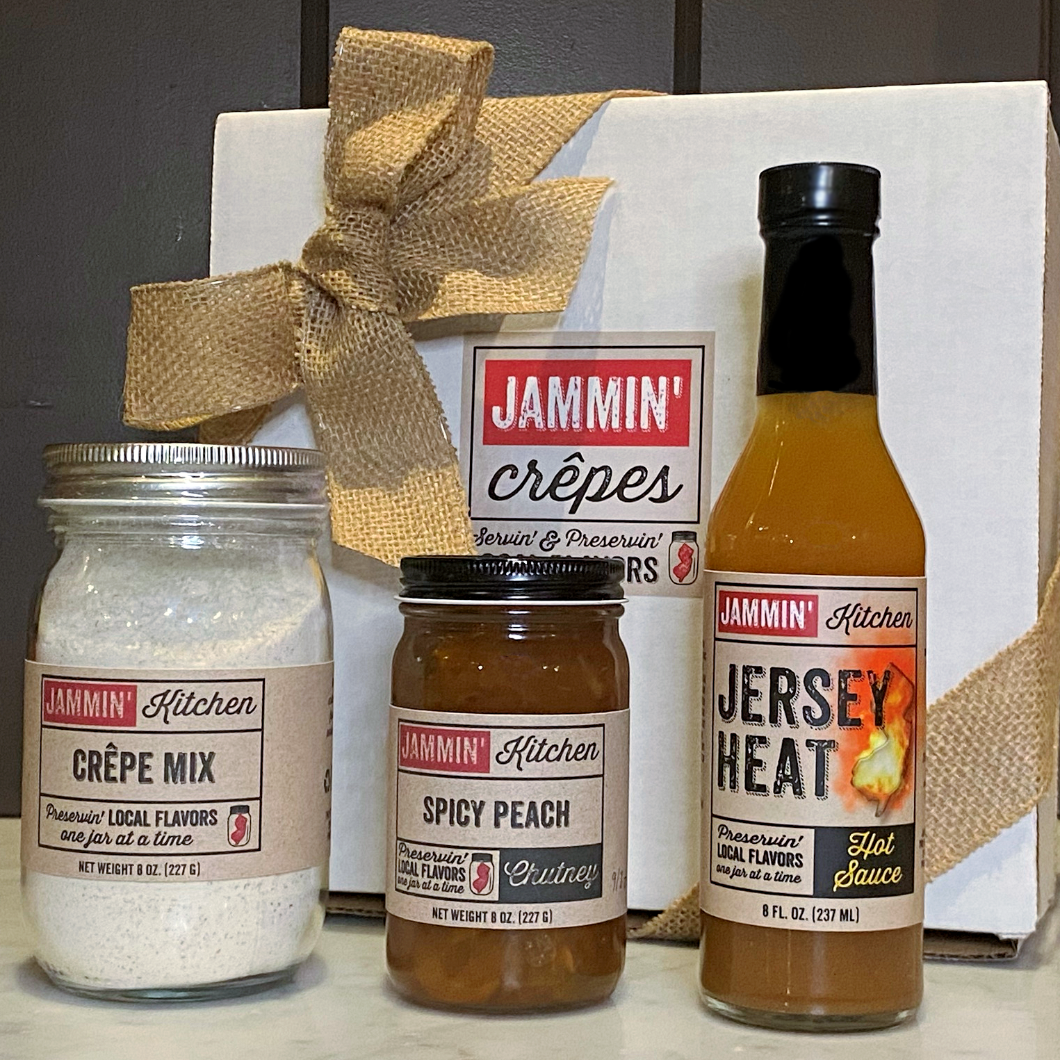 A gift box featuring our “Jersey Heat” Hot Sauce, Crepe Mix, micro-batch Spicy Peach Chutney & recipe for our popular “Jammin’ Turkey Club” crepe, featured on “Diners, Drive-ins & Dives”!